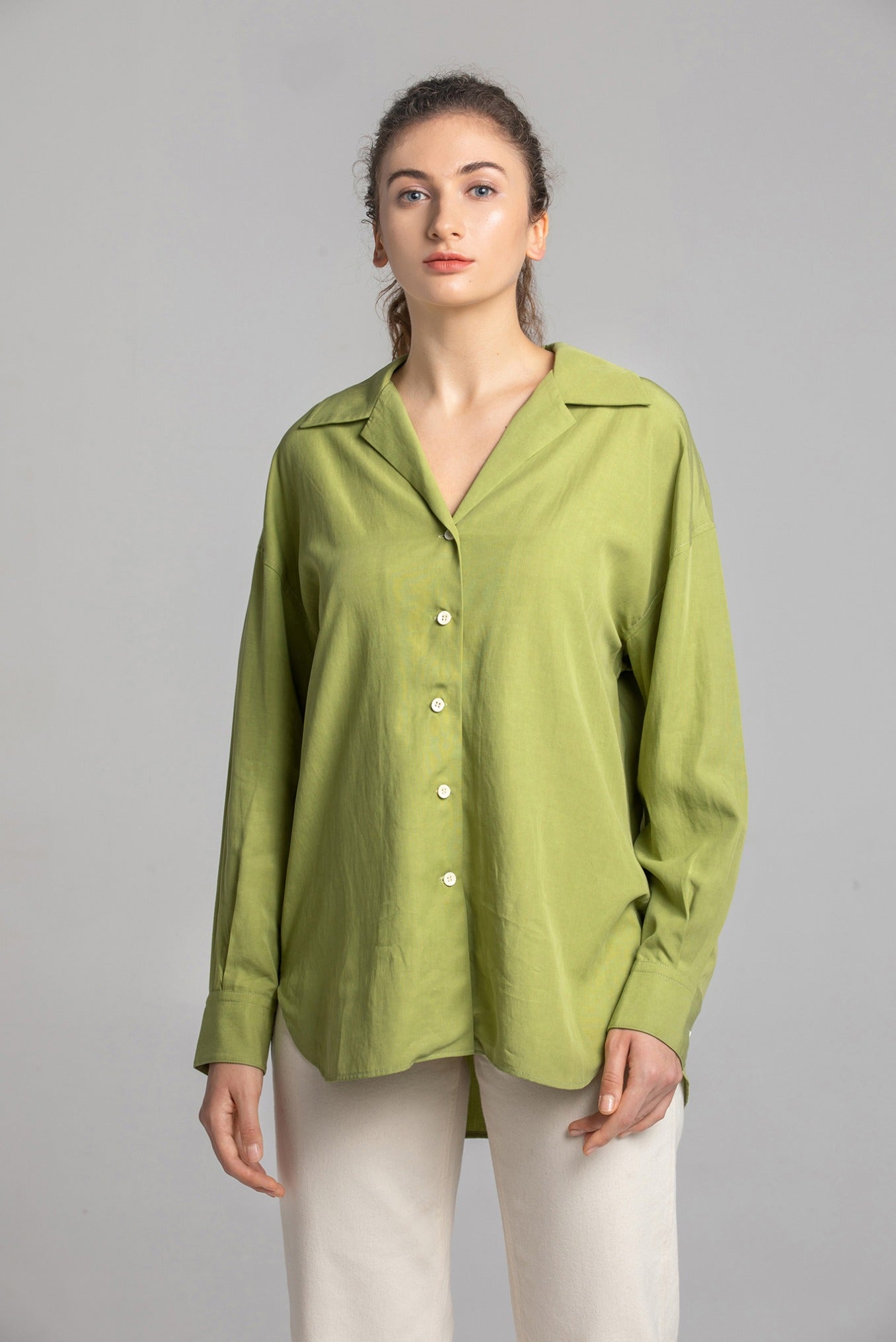 光沢と落ち感がきれいなオーバーサイズシャツ。Vネック×ドロップショルダーで抜け感を演出。シャツテールでタックインもアウトも決まります。