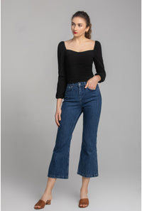 女性らしいカッティングの深めハートネック。サイドジッパーで着脱しやすく、背面スモックで身体に沿ってフィット。デニム合わせでデイリーに、スカート合わせで華やかに。