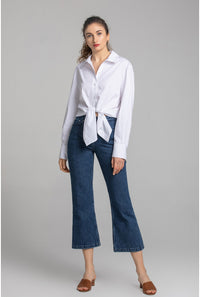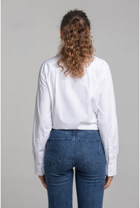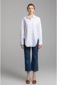 コットン100%のポプリンを使用したホワイトシャツ。ルーズフィット×フライフロント×2ボタンのバレルカフスで、ミニマルにきれい見え。レギュラーカラーの端正さは、プリントスカートにもジャケットスタイルにも好相性。