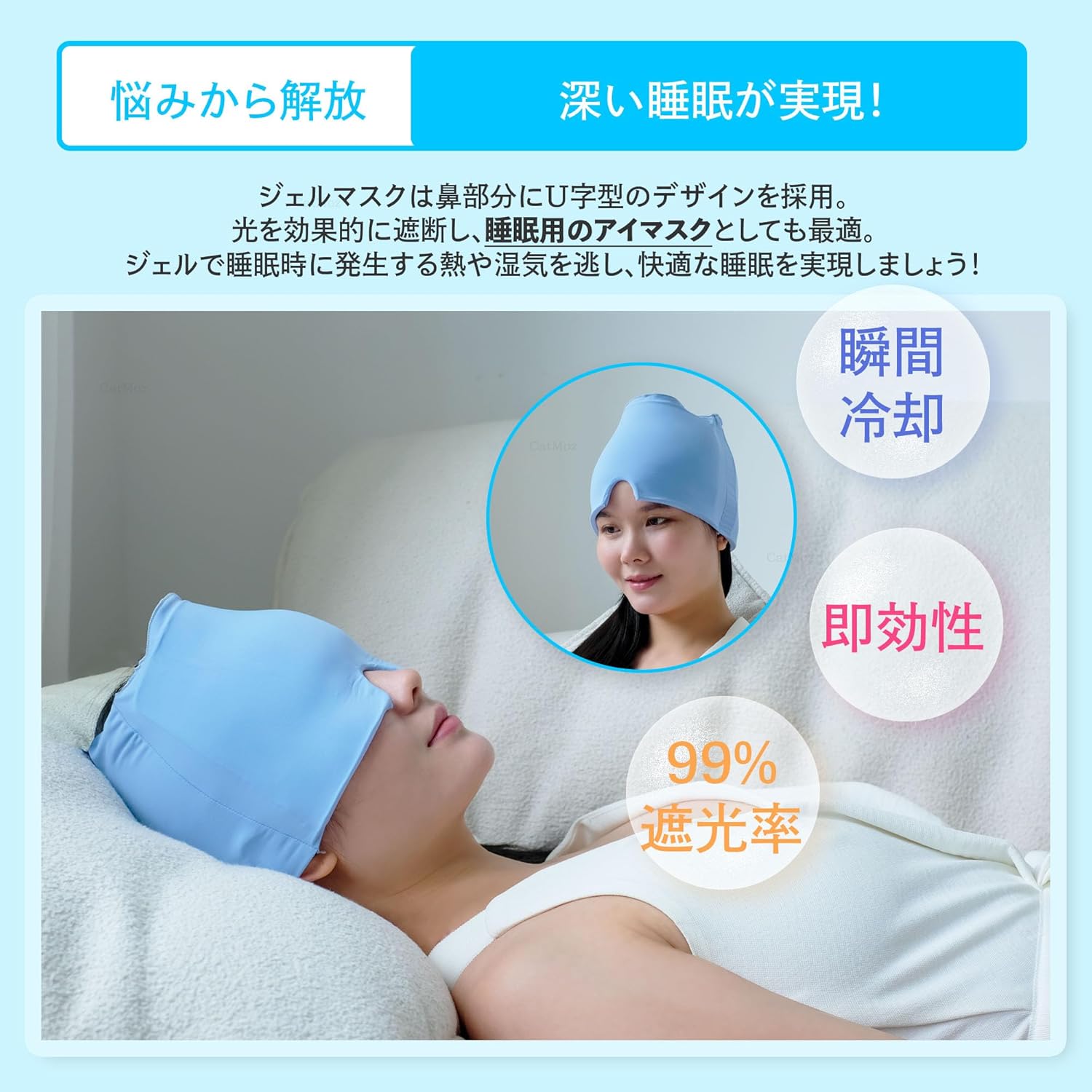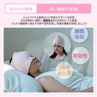 トップオープン(頭頂部が空いた)キャップ型。前後それぞれに8mm厚のジェルパッドを配置した二重構造で、ひんやり感が長続き。冷蔵・冷凍でクールダウン、電子レンジでやさしく温めてリラックスできる冷温両用タイプ。V字カットで鼻周りの圧迫と息苦しさを軽減し、光も遮って快適にフィット。就寝前・ワーク後・運動後のクールダウン、夏の熱対策に最適です。